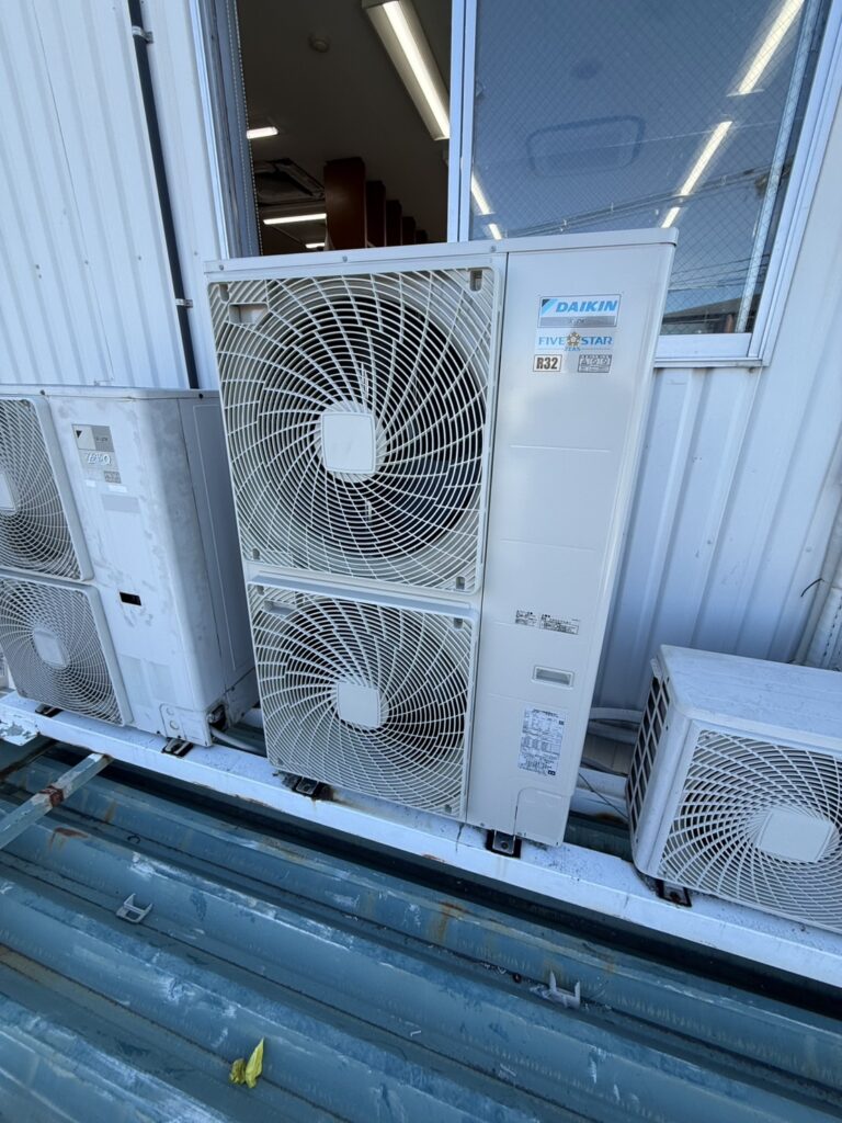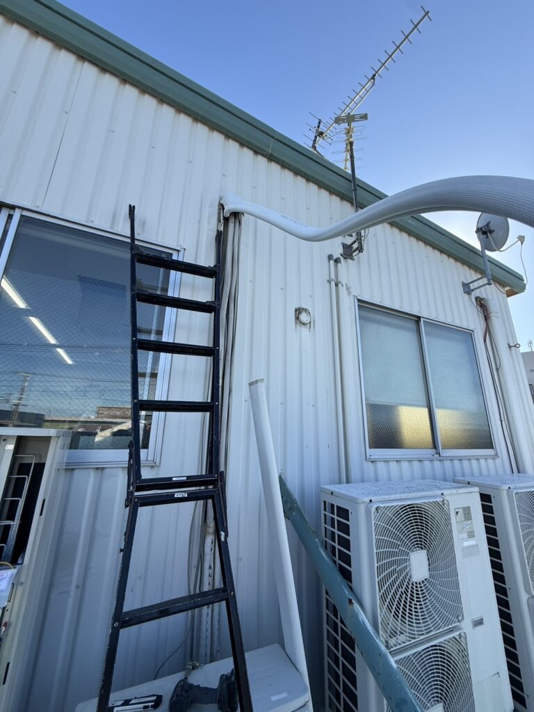 室外機はユニック車を使用して安全に入れ替えをし、あわせて冷媒配管も新しく交換しております。