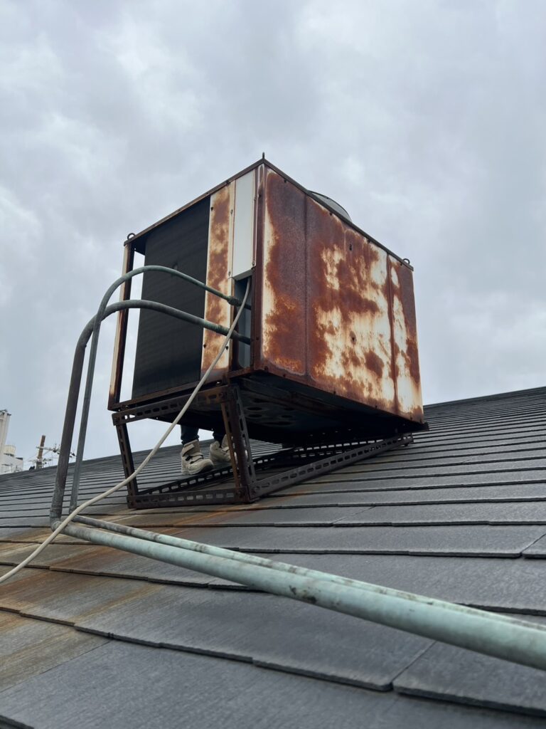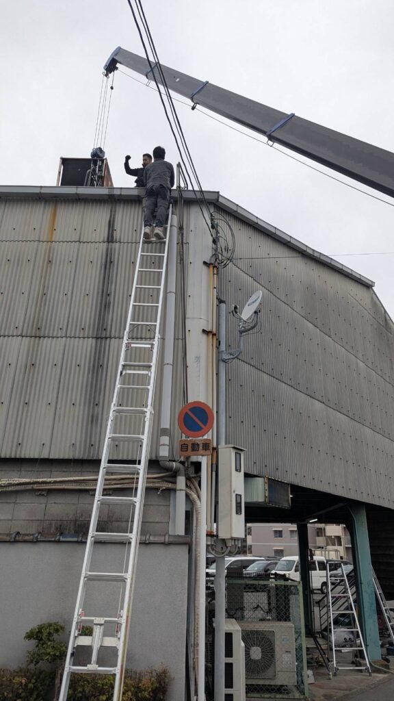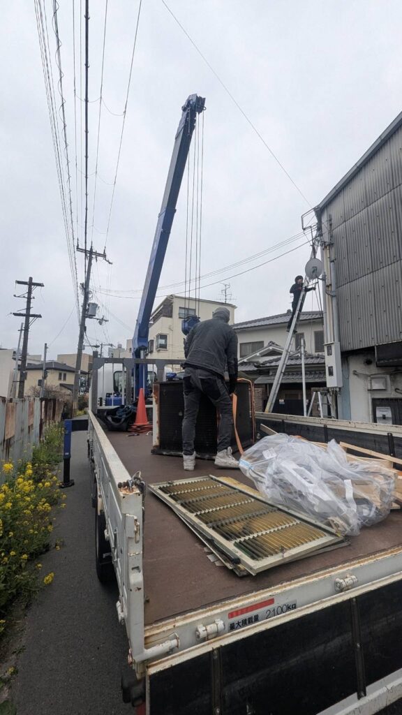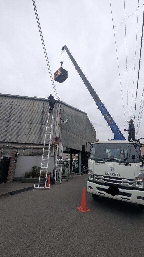 また、今回の現場では室外機が屋根上に設置されていたため、レッカーを使用した搬出作業もあわせて実施しました。