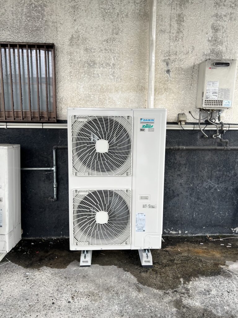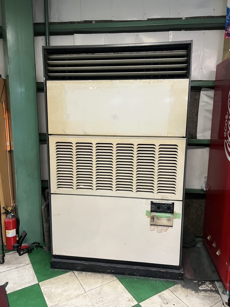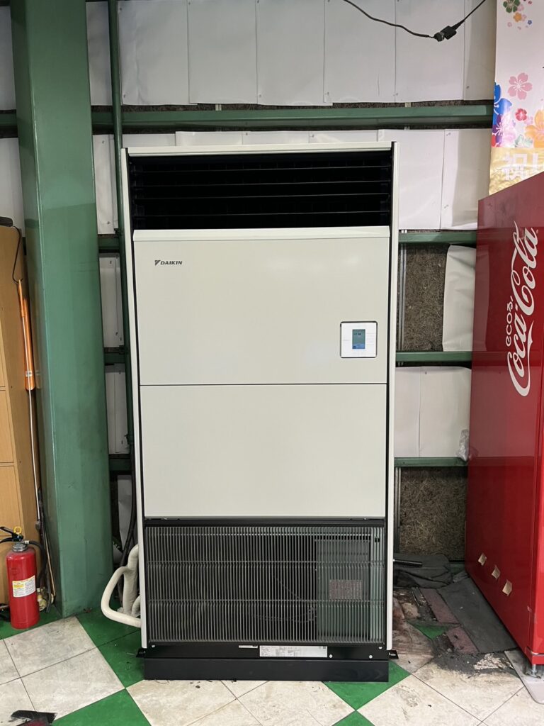 撤去後は、新たに床置き8馬力の業務用エアコンを設置しました。