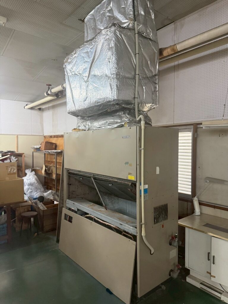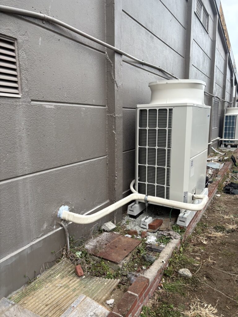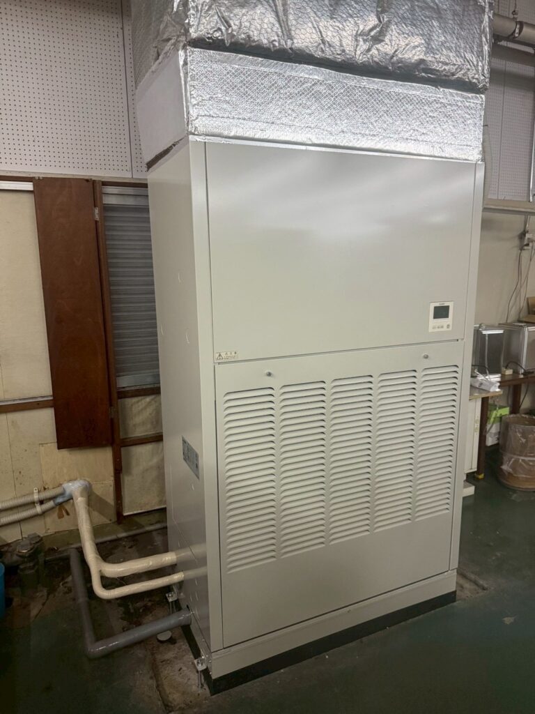 今回は淡路市内にて水冷式設備用床置きエアコンから、空冷式に更新した工事の施工事例です。